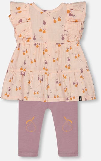 Baby Girl's Printed Muslin Tunic And Organic Cotton Legging Set Peach With Pears And Purple