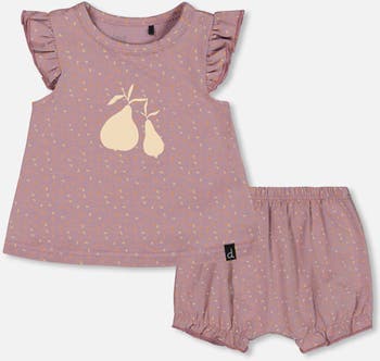 Make every warm weather occasion a little bit sweeter with our Printed Organic Cotton Top and Bloomer Set Purple with Pear Seeds. Detailed with a darling allover pear print, this two-piece set offers head-to-toe coordination with an elastic waist bloomer short and a stretch jersey top with flutter sleeves and a double pear print on the chest. .