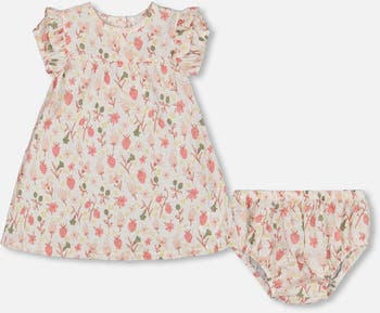 Baby Girl's Printed Seersucker Dress And Bloomer Set Pink Flowers On Cream Background