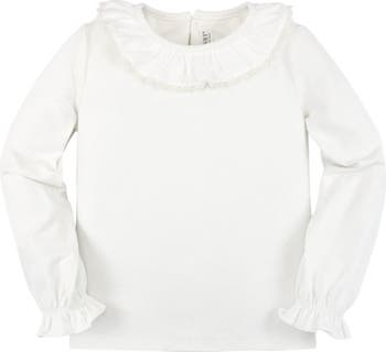 Our wear-with-anything knit top is the fall essential she won't want to take off. Features a woven ruffle neck collar with lace trim for that special touch, a soft knit bodice, gently belled sleeves with elastic ruffle cuffs, and a back keyhole neck closure for easy on and off. We can't wait to layer this with our suspender skirts and jumpers!