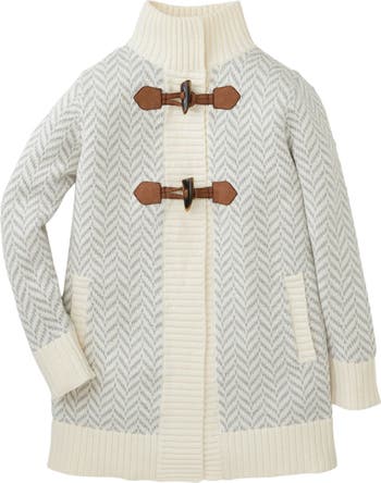 Keep your girl cozy and chic in our long sweater coat in super soft organic cotton. A subtle tan and ivory houndstooth knit pattern adorns this beautiful coat, along with contrasting rib trim and toggle closures made of faux suede and faux horn. A neutral to go with any outfit!