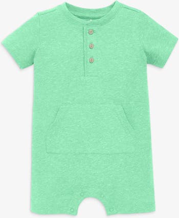 A warm-weather version of our heathered henley romper. Perfectly lived in out of the package and softer than your most cuddly blanket. Made from 60% cotton/40% recycled polyester this shortie romper is subtly-textured and feathery soft. Romper features three front buttons, a kangaroo pocket and bottom snaps. Pre-washed to minimize shrinkage.