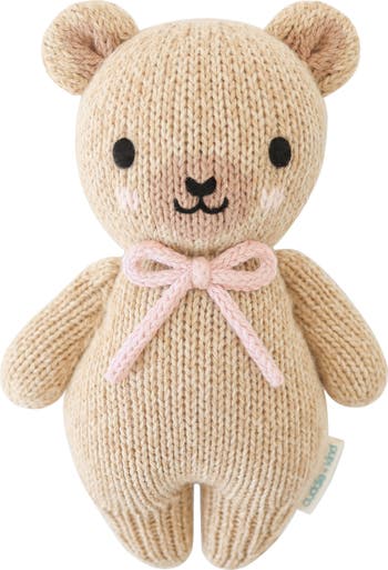 Hand knit from soft Peruvian cotton and stuffed with hypoallergenic polyfill, this plush baby bear toy makes the perfect cuddle buddy for your kiddo.