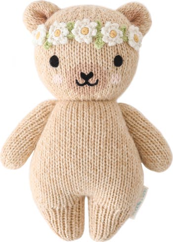 Hand knit from soft Peruvian cotton and stuffed with hypoallergenic polyfill, this flower-crowned baby bear toy makes the perfect cuddle buddy for your little one.