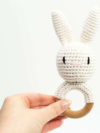 Our handmade sweet animal-faced rattle toy with teething handle is the perfect gift for any newborn. Shake for a gentle sound that is stimulating and will bring a smile to any baby.