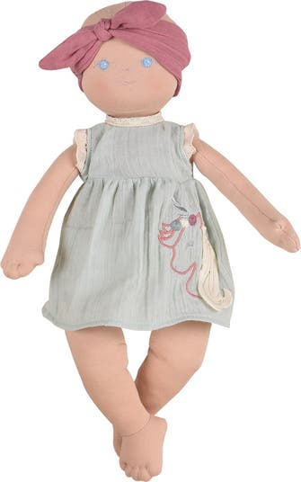 This sweet doll handmade from soft, organic cotton wears a unicorn-embroidered dress and is ready to be your little one's new playmate.