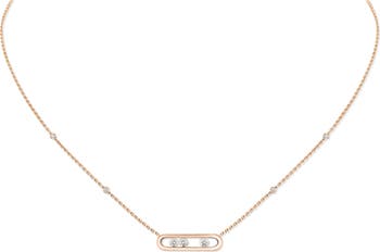 Set within a bar pendant, three floating diamonds—representing the love of yesterday, today and tomorrow—move when you do, reflecting the light in the most captivating way. This handcrafted heirloom necklace is made even more beautiful by additional bezel-set diamonds detailing the dainty 18-karat rose-gold chain.