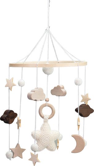 Introducing our enchanting Nursery Mobile in Wooden Galaxy, a delightful addition to your little one's nursery. Handcrafted with love and care, this mobile combines the timeless beauty of wood with the cozy charm of crochet to create a captivating and soothing visual display for your baby.This wooden nursery mobile is not only visually captivating but also provides sensory stimulation for your little one. As they gaze at the rotating star and the charming wooden figures, their eyes and minds will be engaged, promoting cognitive development and encouraging curiosity.Whether you are creating a calming space for your newborn or adding a touch of natural elegance to your toddler's room, our Wooden Nursery Mobile with Crochet Star is the perfect choice. Embrace the tranquility and wonder it brings as your little one drifts off to sleep or discovers the joys of exploration. Handcrafted wooden nursery mobile with a charming crochet star centerpiece