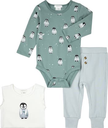 Adorable penguins pose and play in the snow on this long-sleeve bodysuit paired with ribbed joggers for a lightweight, comfortable outfit perfect for a day of play. The adorable look even comes with a spare coordinating bodysuit you can stash in the diaper bag for emergency outfit changes.