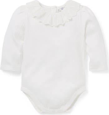An everyday essential for baby, made extra special in soft cotton pointelle. With a ruffle collar and eyelet trim for extra frills.