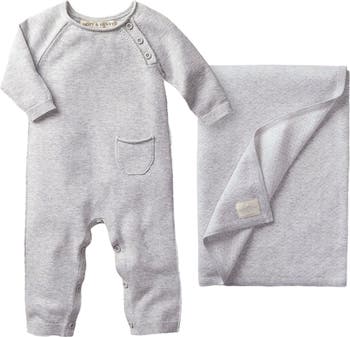 This romper features soft rolled edges, a tiny pocket, and buttons at the legs and shoulder. Fine gauge yarns allow for maximum softness on both the outside and inside of the garment. The blanket features an intricate diamond pattern and a double jacquard construction.