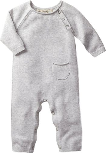This organic cotton raglan sweater romper offers all-in-one dressing for your baby. This item features soft rolled edges and a tiny pocket. Dressing baby is easy with buttons at the legs and shoulder. It is knitted in fine gauge yarns to allow for maximum softness on both the outside and inside of the garment.