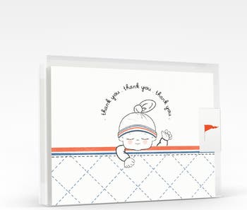 This 8-pack of greeting cards is elegantly illustrated by artist Ingrid Ramus, founder and owner of the Ramus & Co brand. Artwork features a baby in a crib saying "thank you". All greeting cards are made in the USA on heavyweight uncoated and locally-sourced and manufactured card stock. Each card is accompanied by a hand-embossed envelope made with heavyweight 95lb paper and a peel-and-stick flap - no licking envelopes here! All Ramus & Co. greeting cards are printed on FSC and SFI certified paper sourced from a regional mill that harnesses 66% of its energy from on-site sustainable sources, such as emission-free hydroelectricity and biomass co-generation from wood waste. All 8 greeting cards come packaged as a boxed set. Husband-and-wife team Calvin and Ingrid Ramus founded Ramus & Company in 2019, in New England, USA. Ingrid, the creative designer behind the brand, originates from Mexico, where she cultivated her skills in fashion and textile design. Drawing from her unique and inquisitive perspective on preppy style, Ingrid prolifically designs whimsical yet classic stationery and lifestyle items.
