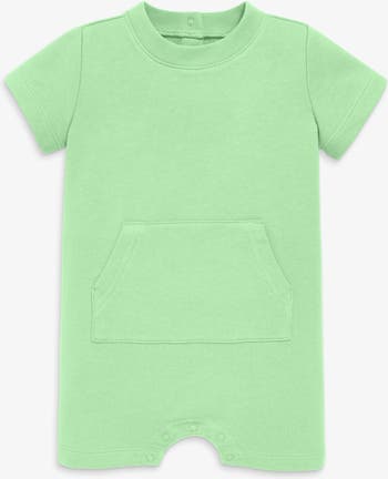 A quick and easy one-piece outfit for baby? We love to see it. Made from 100% cotton French terry this shortie romper is naturally soft with a breathable thickness that stands up to play. It features neck and leg snaps as well as a kangaroo pocket. Pre-washed to minimize shrinkage.