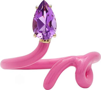 A sparkly amethyst twinkles at the tip of this swirling, vine-like ring covered in bright bubblegum-pink enamel.