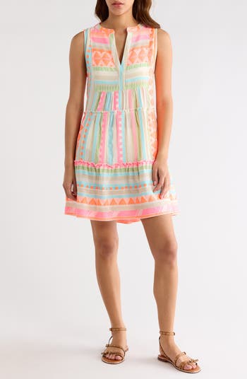 A Southwest-inspired arrow pattern is woven into this cover-up mini styled with a sweet babydoll silhouette and handy side-seam pockets.