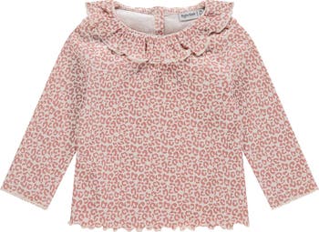 This cream-toned long sleeve top features an allover pink-toned leopard print, lettuce edge detailing, and a fluttered collar.