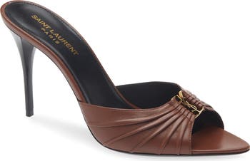 The house-signature interlocking monogram tethers the toe strap of this pointy-toe sandal crafted from chocolaty Italian leather and balanced on a steep heel.