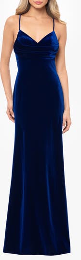 An elegant neckline drape brings texture and dimension to this figure-skimming gown cut from rich velvet and finished with a skin-showing cutout back.