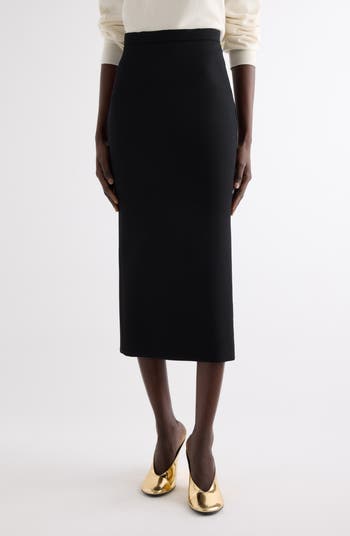 A back godet adds kicky flare to this polished midi skirt fashioned from fluid crepe cady.