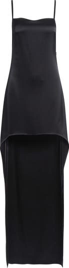 Nicolas Di Felice channels space-age sleekness in this lustrous satin gown with an alluring open back and a dramatically curved high-low hem that gives way to an elegant train. An 'AC' logo in tonal embroidery nods to founder André Courrèges.