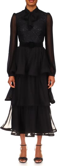 Badgley Mischka Long Sleeve Tiered Georgette Cocktail Dress
