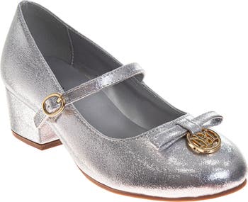 Polished logo hardware accents the instep bow on a charming metallic pump lifted by a subtle block heel and secured with an adjustable mary jane strap.