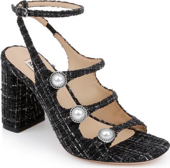 Pearly buttons saunter down the vamp and highlight the tweed upper on an elegant sandal lifted by a wrapped block heel and secured with an adjustable buckle closure.