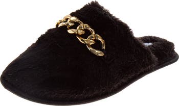 Add a touch of high-fashion glamour to your loungewear with these Badgley Mischka ladies’ scuff slippers. Featuring a rich, fuzzy faux-fur exterior and a striking gold-tone chain accent, these slippers perfectly blend sophisticated jewelry-inspired design with cozy home comfort. The open-back silhouette and plush materials make them an effortless choice for the fashion-forward woman.