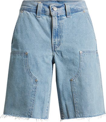 Inspired by dad jeans from the '90s, these nonstretch-denim utility shorts have a roomy, low-slung fit and frayed hems cut to a casual-cool knee length.
