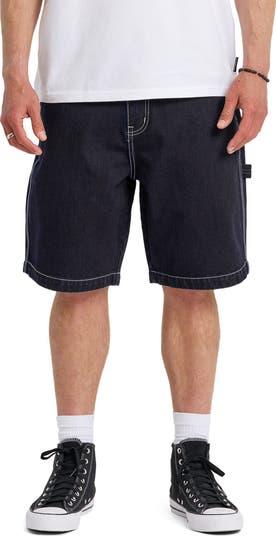 Framed in durable white stitching, these carpenter shorts cut from first-day-blue cotton denim feature a relaxed fit for working on comfort and room to hold tools for working on projects. They sit above the hips and hit around the knees for an old-school look that matches their old-favorite vibe.