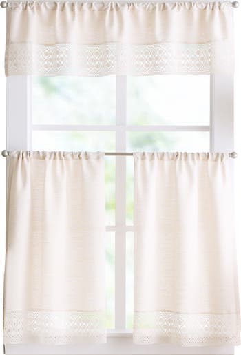 Crochet-inspired accents finish these curtain panels and valence that softly diffuse the light bringing decadent texture and interest to your cozy space.