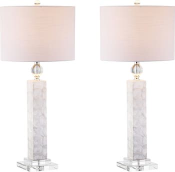 The shimmering ivory toned hues in this column table lamp add warmth to the overall look. In a mother of pearl finish with a clear crystal square base, sphere object, and finial the total piece exudes sophistication and elegance. Topped with a white linen fabric drum shade.