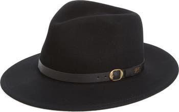 Finely textured wool structures a broad-brim fedora with a smart leather band.