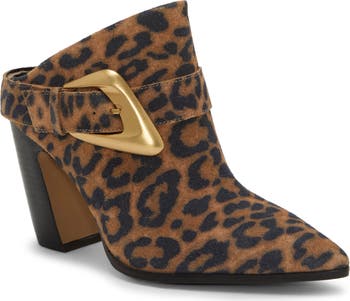 A curving heel, sharp pointy toe and golden buckle give playfully overstated style to a leather mule.