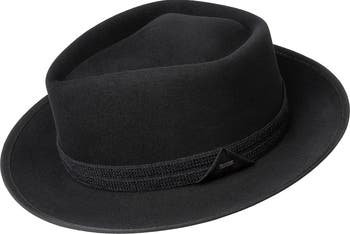 This handsome fedora is made from wool with the label's luxurious Elite Velour finish and is wrapped at the crown with knit tape. A finely woven sweatband provides a snug fit and comfort.