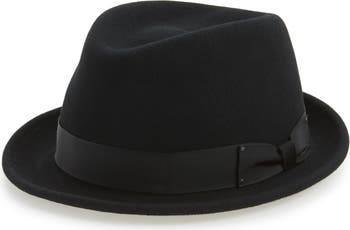 A small logo button accents the grosgrain-wrapped crown of a classic wool felt fedora that is both packable and water-repellent.