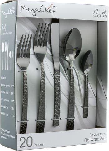 The MegaChef Baily 20-piece Flatware Set is made of food grade stainless steel, the quality material in high standard resists corrosion and rust, ensures long-lasting use. The Baily Silverware Set is smoothly finished with no sharp edges, safe and comfortable for both adults and children. Each piece of Utensil Set in this versatile collection is perfectly weighted and balanced to feel comfortable in your patrons hands and with its proper sizes this set can fit perfectly your other dinnerware or tableware set.