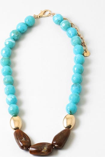 Bring bold beauty into your style this season with this gorgeous, chunky necklace. The brown, gold, and turquoise beads bring a stunning, organic touch through their asymmetric shape. Designed by Erin McDermott in Charlotte, North Carolina, this piece ships from the USA.