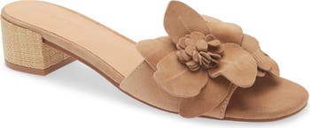 A detailed flower embellishes a chic suede sandal set on a wrapped block heel.