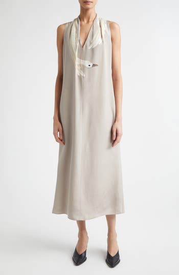 A painterly swan drapes around the neck like a surrealistic mink stole on this sleeveless dress cut in a slim straight silhouette from fluid silk.