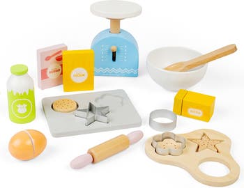 On your marks... get set... bake! Invite your little muffins to join you in the kitchen to make a (pretend) batch of cookies with their own miniature kids baking set. Our Baking Cookies kit is jam-packed with a wooden baking tray, kitchen scales, pastry cutters, a rolling pin, mixing bowl, sliceable butter, an egg, flour, sugar and milk.Kitchen role play is a fun way to teach toddlers and young children about kitchen safety, as they learn how to play-prepare their baked goods. it's also excellent for enriching their imagination and creativity, while helping them pick up key life skills.This children's baking set is made from sustainable FSC® Certified wood and coloured with non-toxic paints and lacquers. Conforms to current European safety standards. 14.2cm H x 10cm W x 4cm D. Suitable for 18+ months.