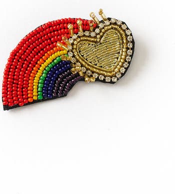 The Bala Mani Beaded Rainbow Brooch Pin is handcrafted by artisan makers in India, who use colorful beads, thread, and sequins to create cute motif brooches. Wear or gift a single pin of a favorite motif or together with other pins to show off a unique sense of style! This bright rainbow with a beaded heart is sure to brighten up someone s day.