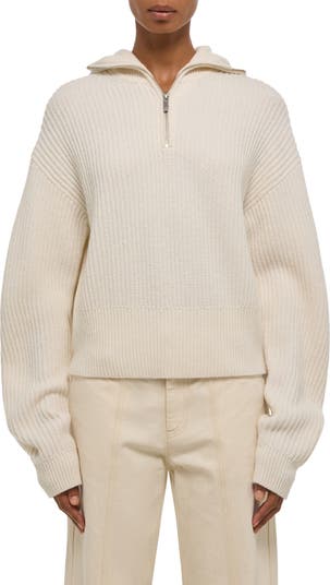 A ribbed balaclava hood brings winter-ready warmth to this quarter-zip hoodie knit in a soft wool blend.
