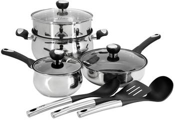 The Oster Baldwyn 10 Piece Stainless Steel Belly-Shaped Nonstick Cookware and Utensil Set embodies the perfect blend of style and functionality for any kitchen enthusiast. Crafted with durable stainless steel, each piece is designed to withstand daily use while maintaining its elegant appearance. The belly-shaped design ensures efficient heat distribution for uniform cooking results, while the nonstick interiors make cleanup a breeze. This set comes with essential cookware pieces, including a 6.9 quart dutch oven with steamer and lid, 3.1 quart saute pan, 1.9 quart saucepan with lid, and 3 pieces kitchen utensils. Whether you're a seasoned chef or just starting your culinary journey, the Oster Baldwyn set equips you with everything you need to unleash your culinary creativity with confidence and ease.