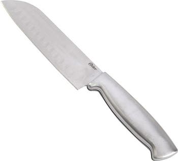 Get slicing and dicing in the kitchen with this Oster Baldwyn 6.5 Inch High Carbon Stainless Steel Santoku Knife. Featuring high carbon stainless steel blade and ergonomic handle design, this knife can cut your food with ease while your hand stays comfortable. To ensure this knife stays in prime condition for years of use, make sure to hand wash only. Take home this fine quality blade for your kitchen today!