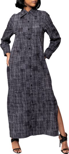 A crosshatch pattern adds muted style points to a shirtdress taken to a maximum length, slashed with side slits and perfected with a pair of handy pockets.