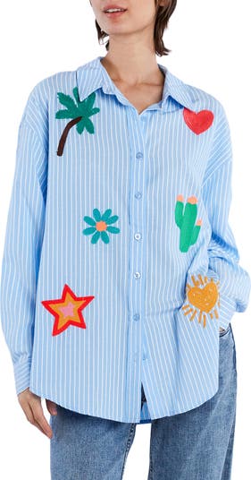 A happy collection of embroidered designs charms this button-up shirt cut from a soft, drapey fabric in a relaxed fit that's sure to complete the cheery vibes.