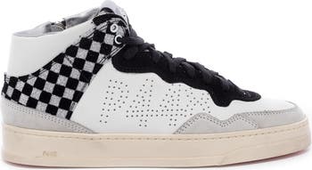 A basketball-inspired silhouette meets our classic checker print. The BaliHi Check is wrapped in white leather with grey leather and black suede trims, accented by a black and silver checker print fabric. The hand-distressed sole adds a laidback touch, while the fuchsia tread gives a welcomed pop of color. The interior-side zipper makes these easy to slide on and off.