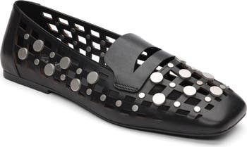 Airy gridded cutouts are intersected with flat polished studs on this striking loafer with warm-weather appeal.